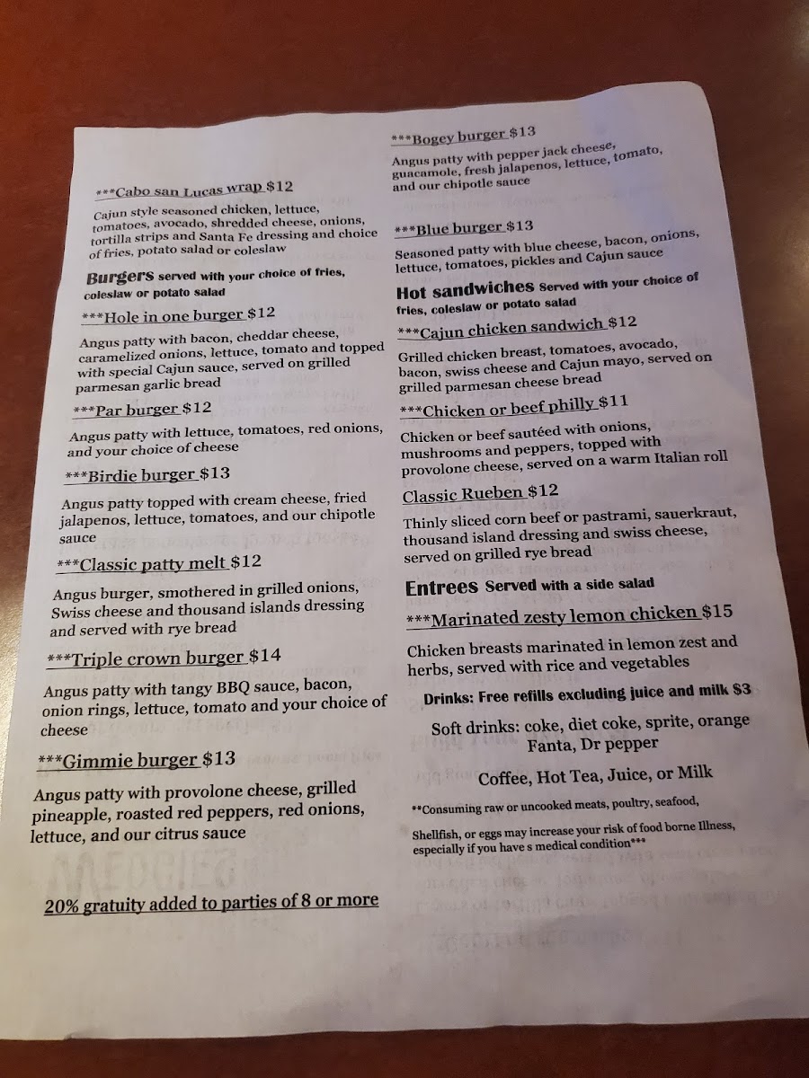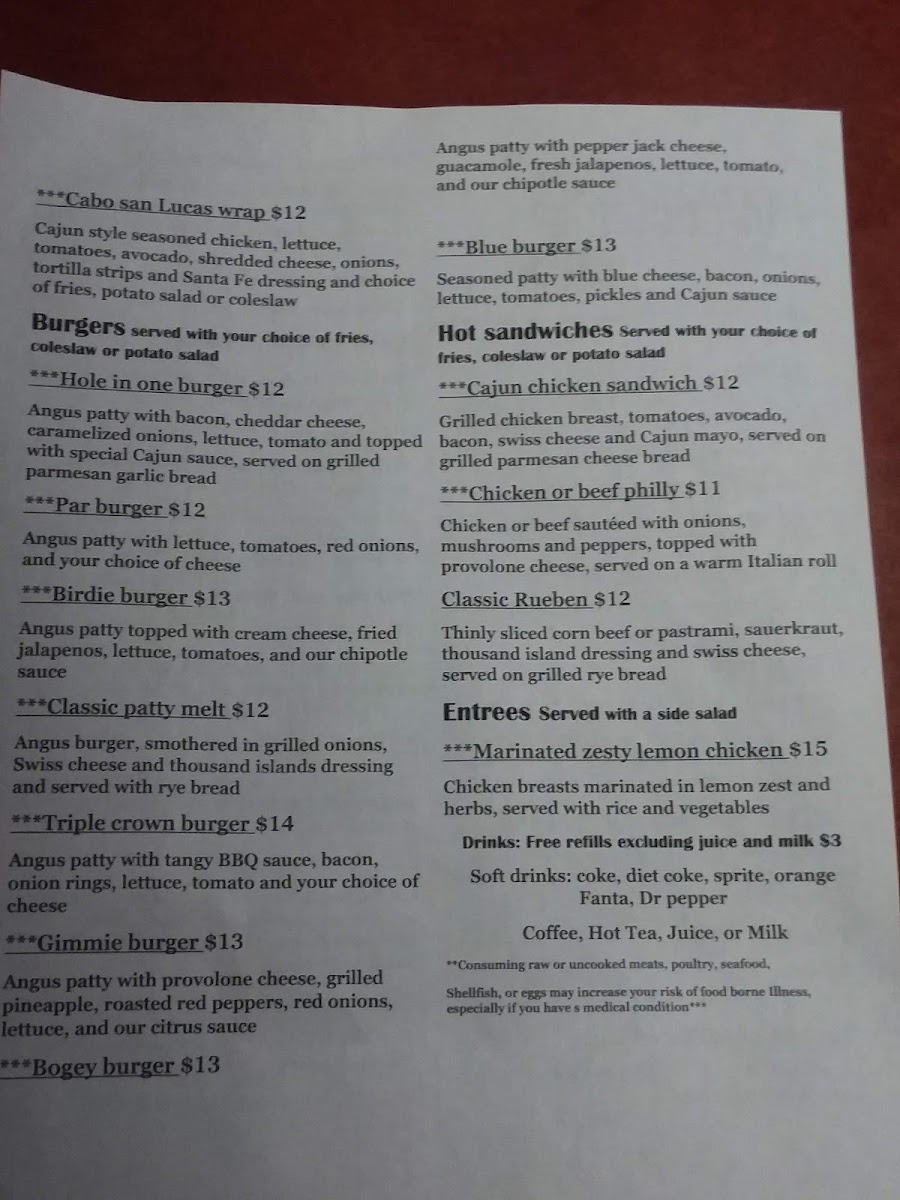 Burgers represent a significant portion of the menu, with various options including the Hole In One Burger, Par Burger, Classic Patty Melt Burger, Triple Crown Burger, Bogie Burger, and Blue Burger. These offer a range of flavors and toppings typical of bar and grill cuisine.