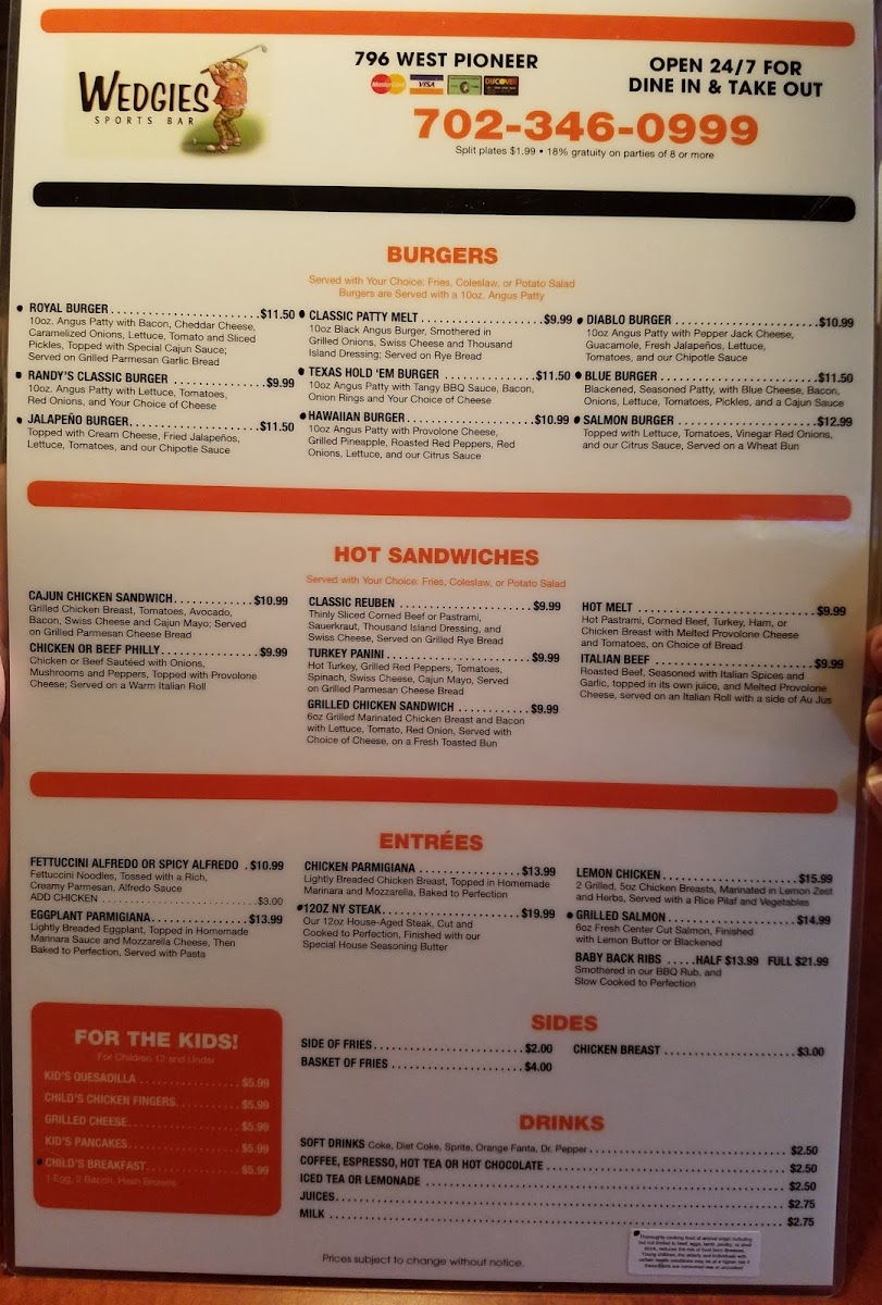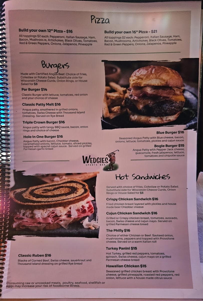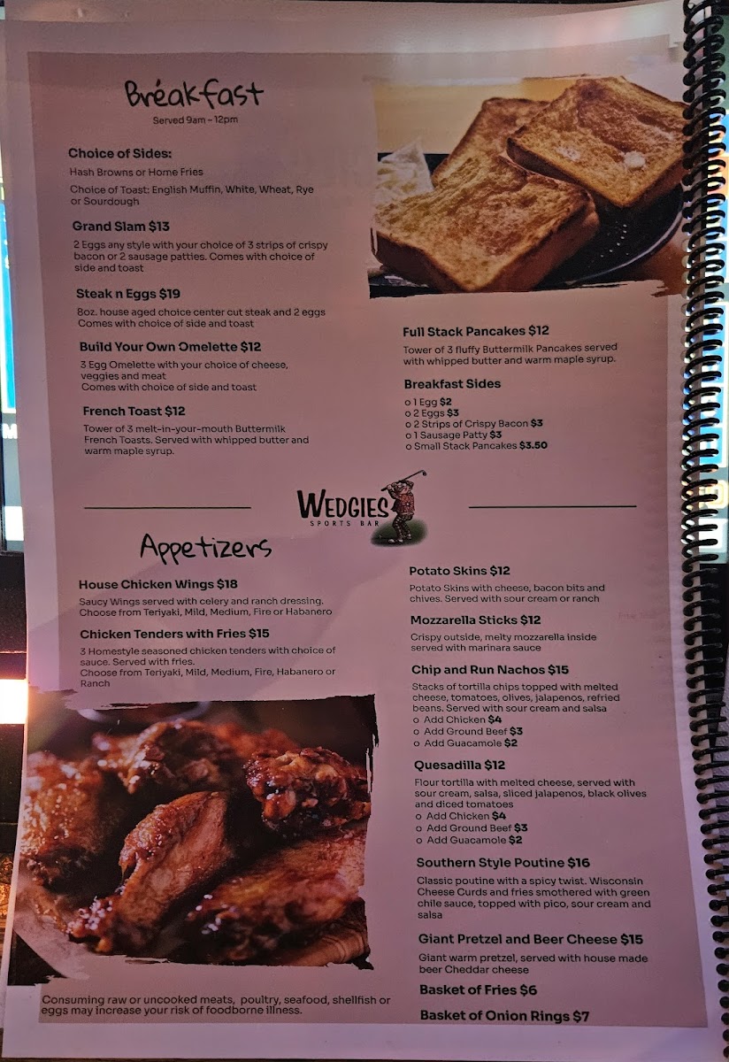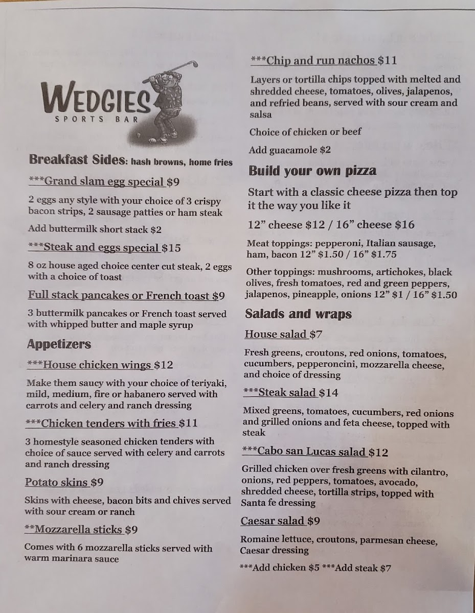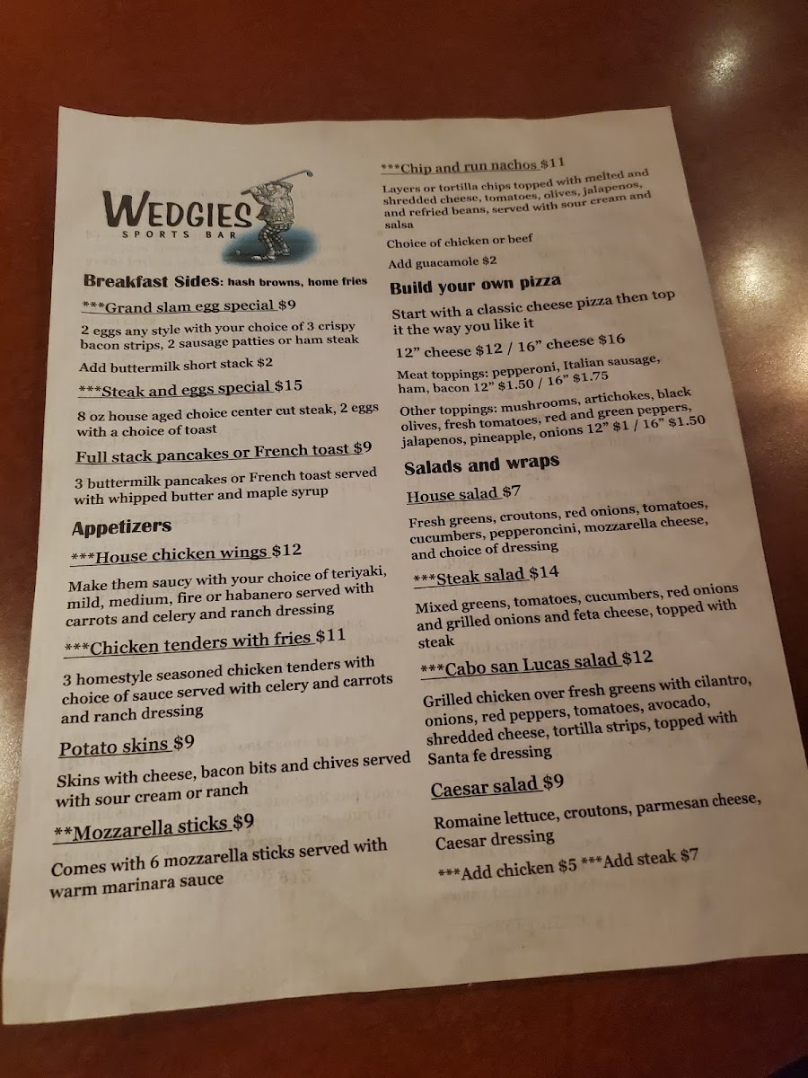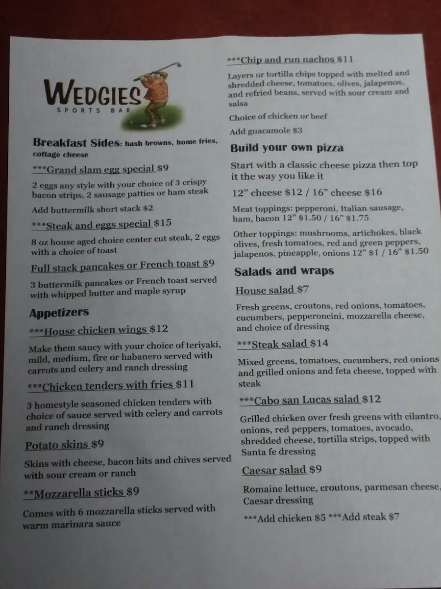 The menu at Wedgies Sports Bar & Grill is organized into several key categories, offering a variety of food and drink options suitable for different times of the day and dining preferences. Guests can choose from a selection of breakfast items, salads and wraps, as well as burgers and casual bar favorites.